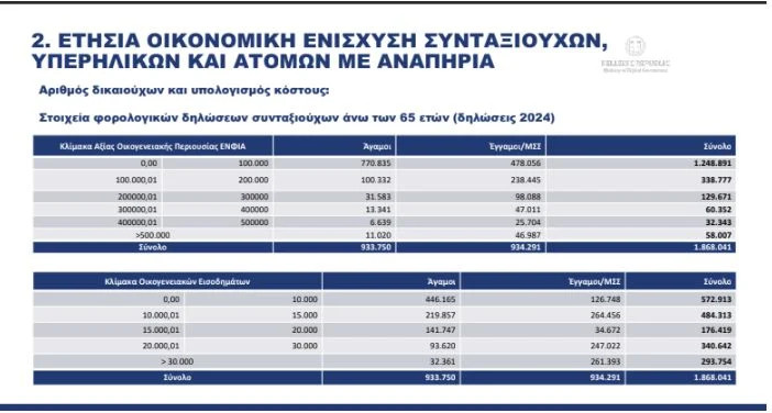 Με τα ανωτέρω εισοδηματικά και περιουσιακά κριτήρια εκτιμάται ότι δικαιούχοι είναι 1.157.551 συνταξιούχοι (το 62%) από τους 1.868.041 συνταξιούχους που είναι άνω των 65 ετών. Επιπλέον δικαιούχοι είναι 248.823 άτομα με αναπηρία και 34.357 ανασφάλιστοι υπερήλικες. Έτσι, η οικονομική ενίσχυση εκτιμάται ότι αφορά συνολικά 1,44 εκατομμύρια συμπολίτες μας και το ετήσιο κόστος εκτιμάται σε 360 εκατ. ευρώ.