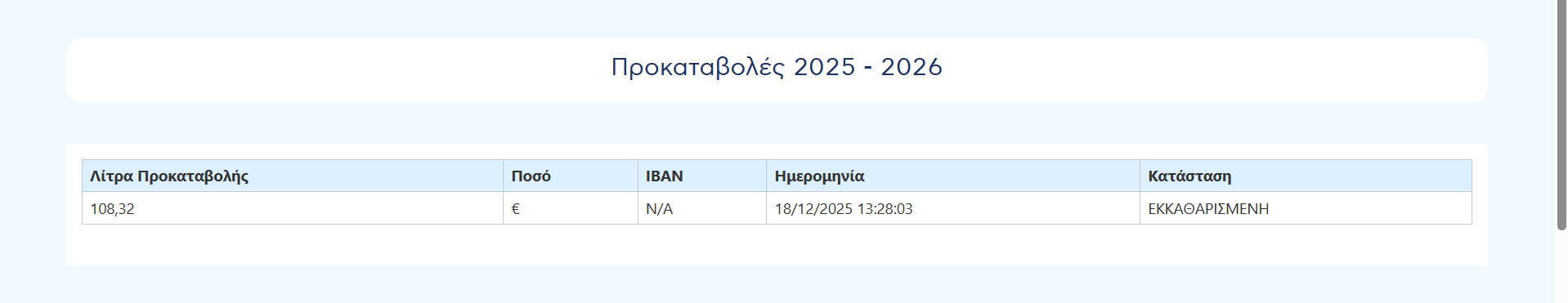 Στον πίνακα στις διασταυρωμενες αγορές όσοι έχουν Πετρέλαιο βλέπετε τα λίτρα της προκαταβολής. Αν κάνετε πολλαπλασιασμο αυτά τα λίτρα με 1.14*, βγαίνει το ποσό προκαταβολής. *1.14 εύρω είναι η τιμή του λίτρου που έχει οριστεί φέτος για τον υπολογισμό.